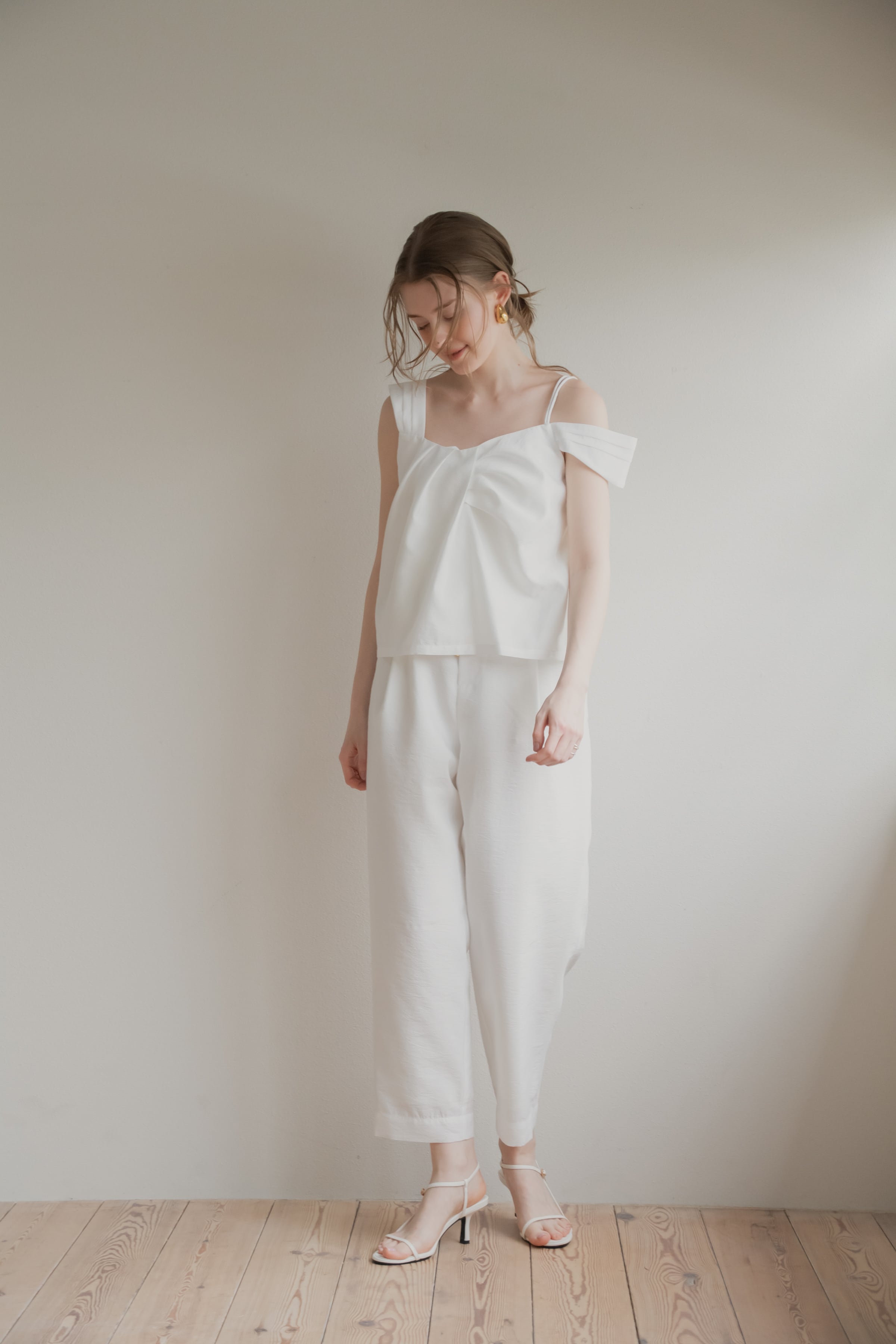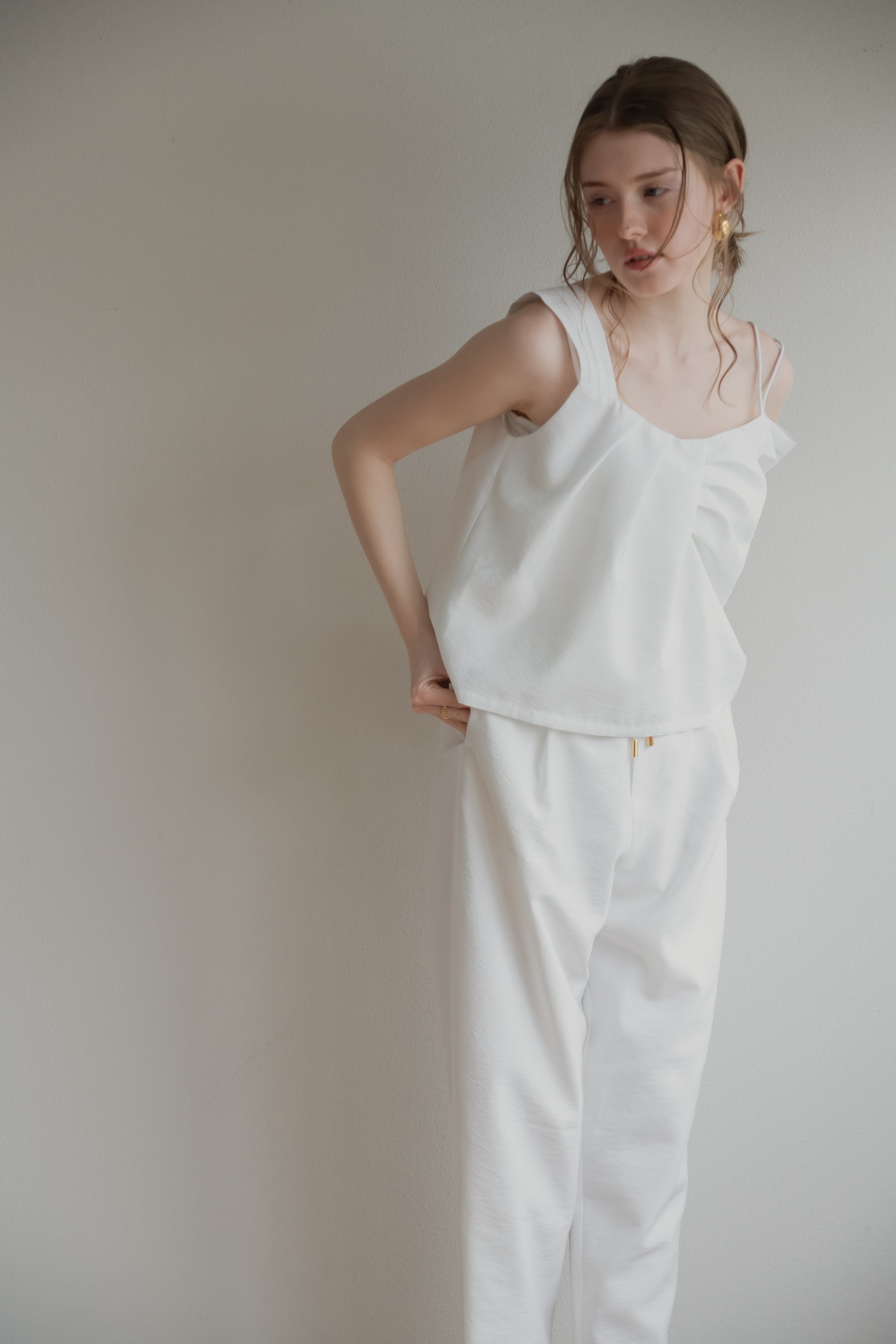 ゴム仕様でリラクシーな履き心地ながら、フロントにあしらったメタルパーツがアクセントになり、インスタイルでもぐっと高見え。