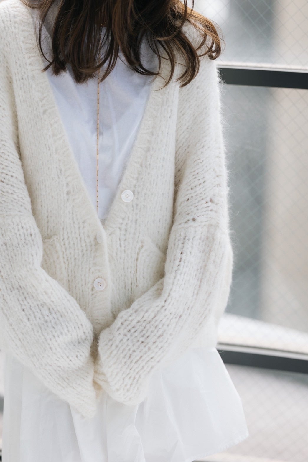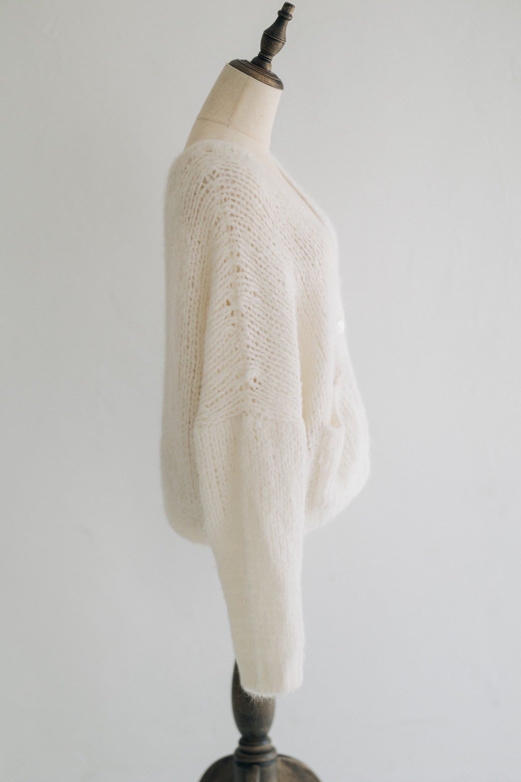 まるで空気を纏うような軽やかさと、ふわふわのモヘアの柔らかさが魅力のハンドニットカーディガン。手編みでしかだせないざっくりとした編み地は、ゆるっと羽織るだけで女性らしい抜け感を演出できます。