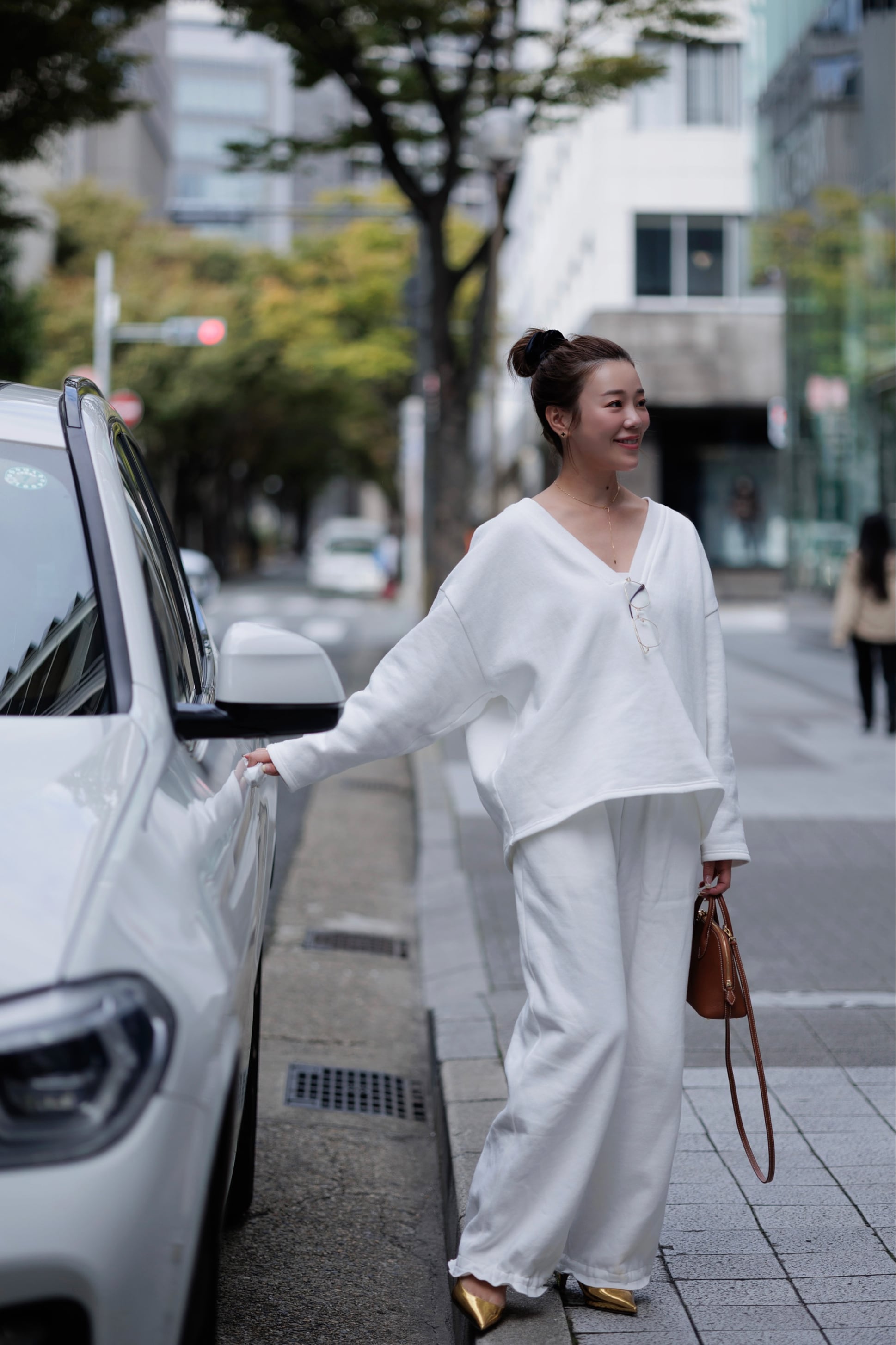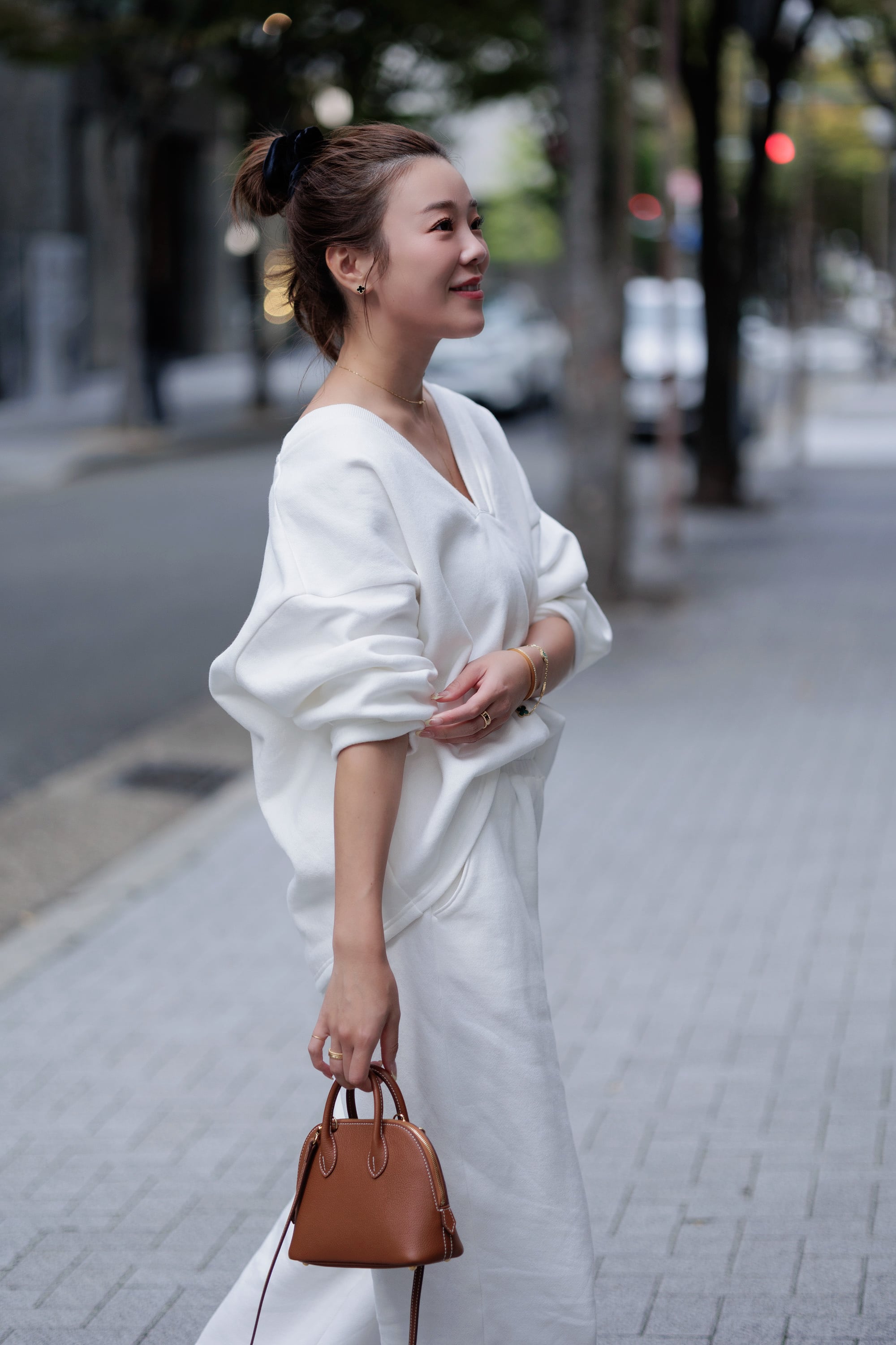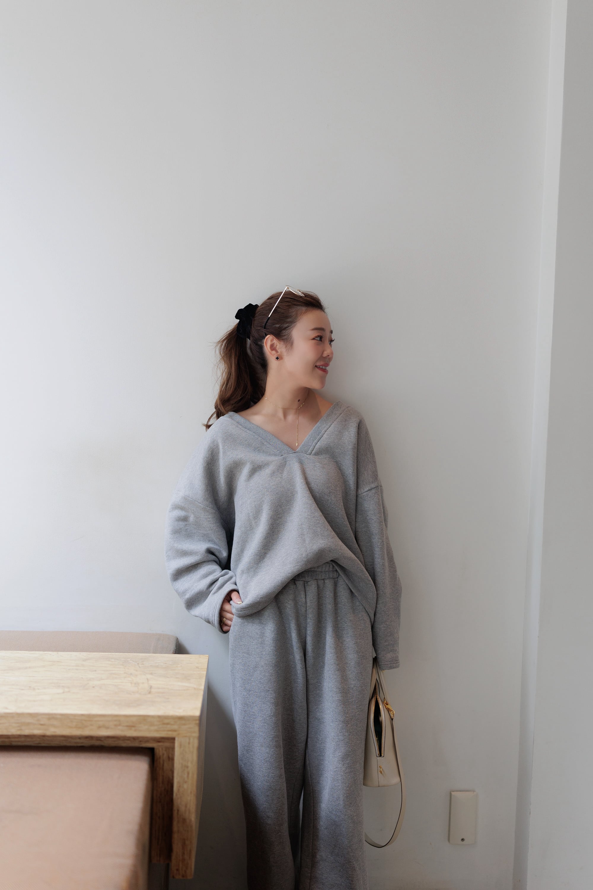 トップスは、抜け感のあるVネックラインとゆるシルエット。