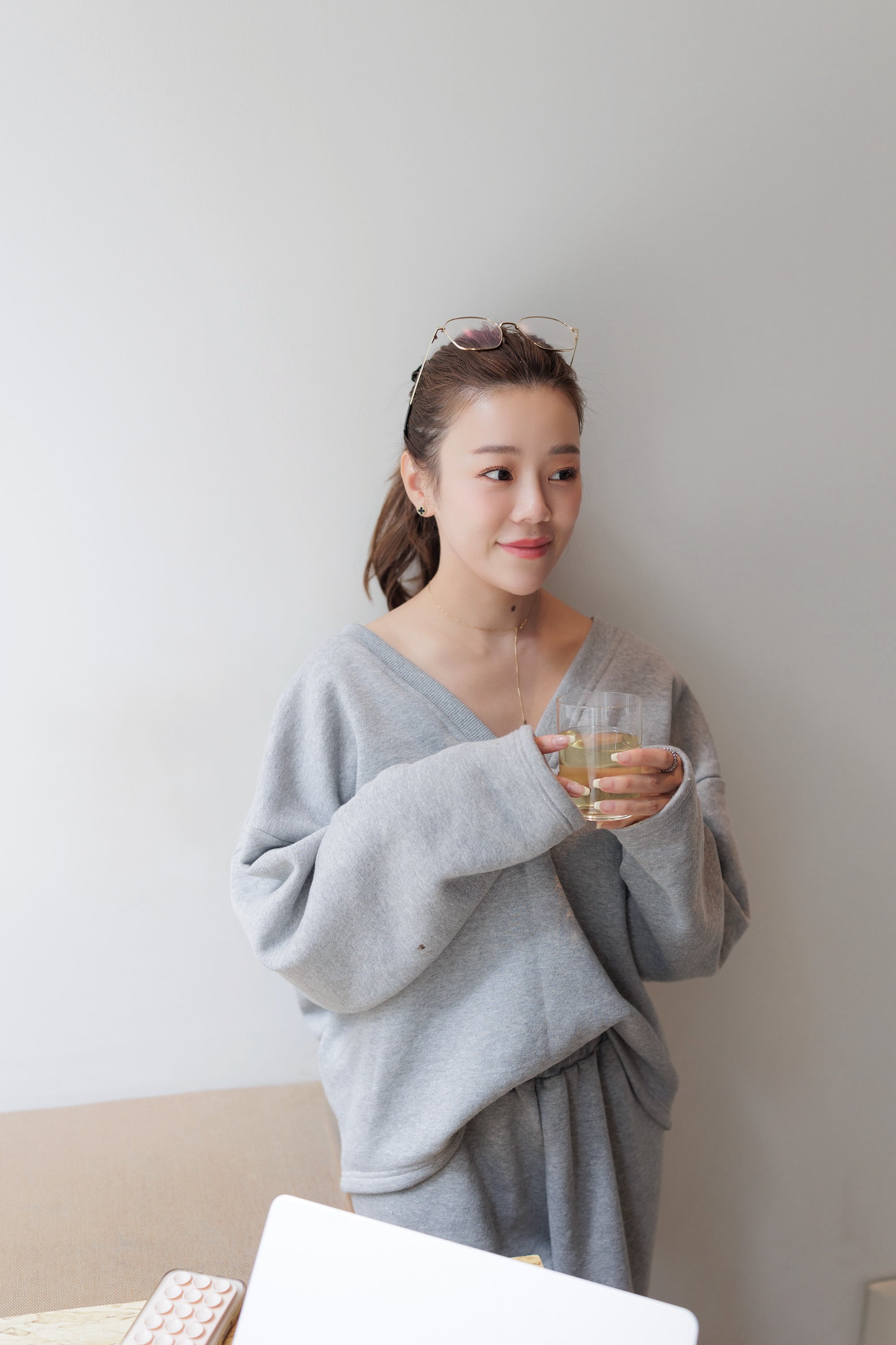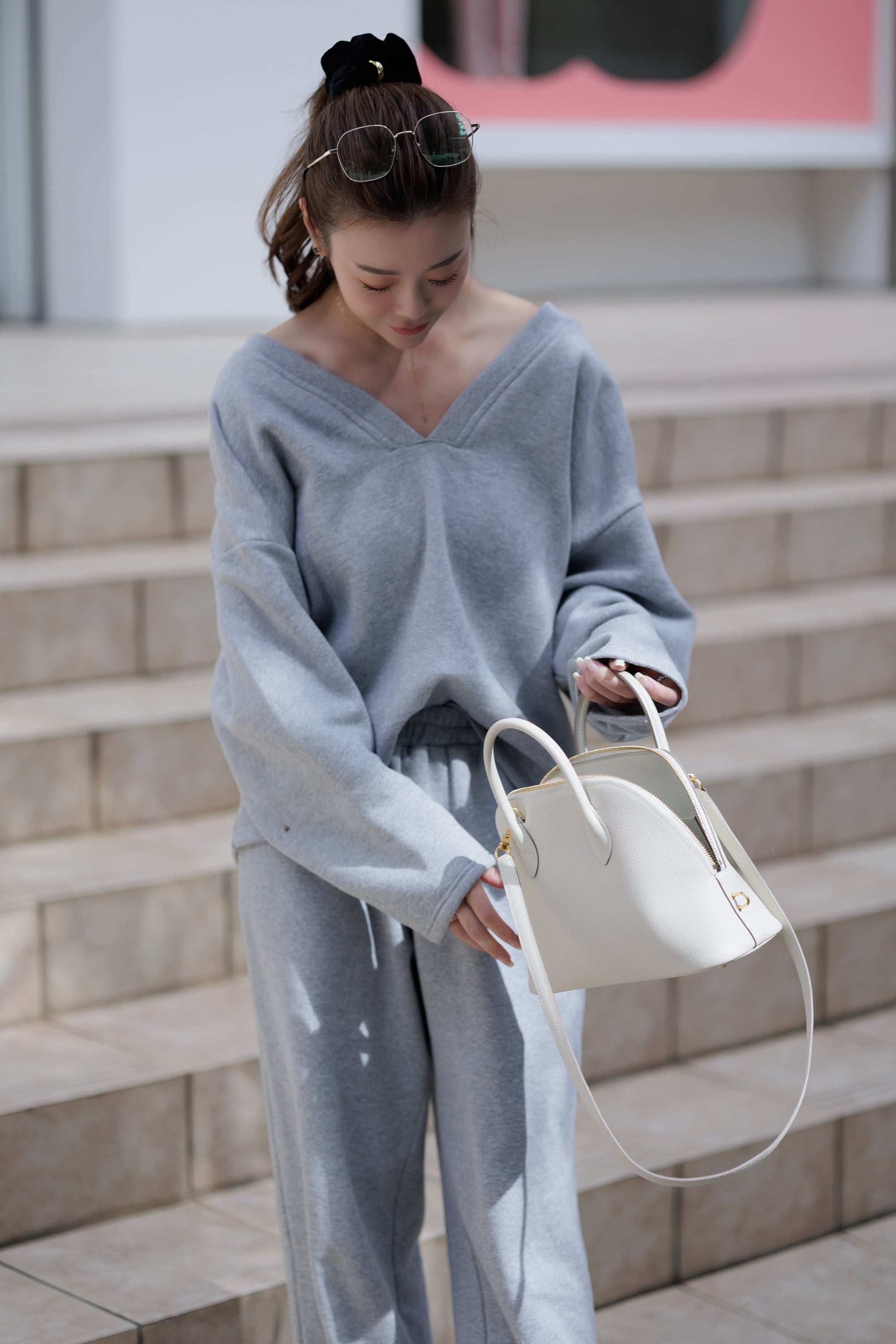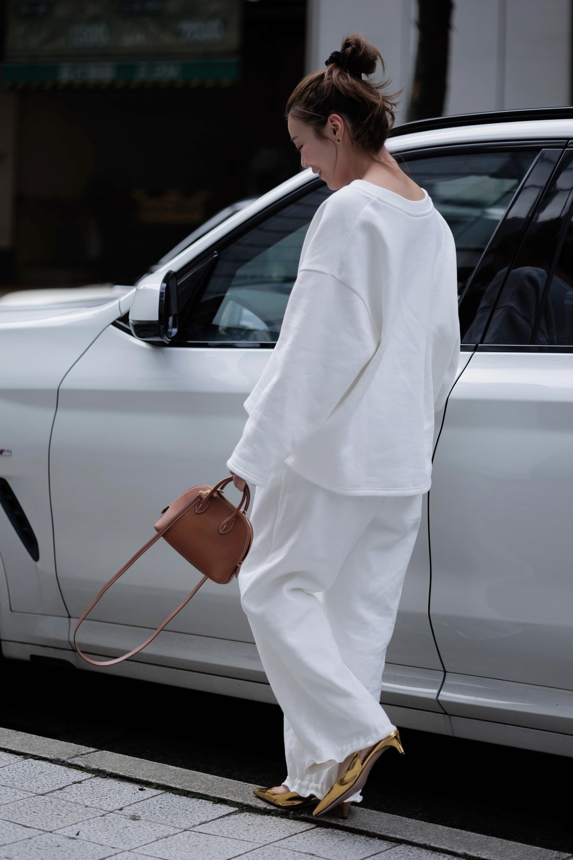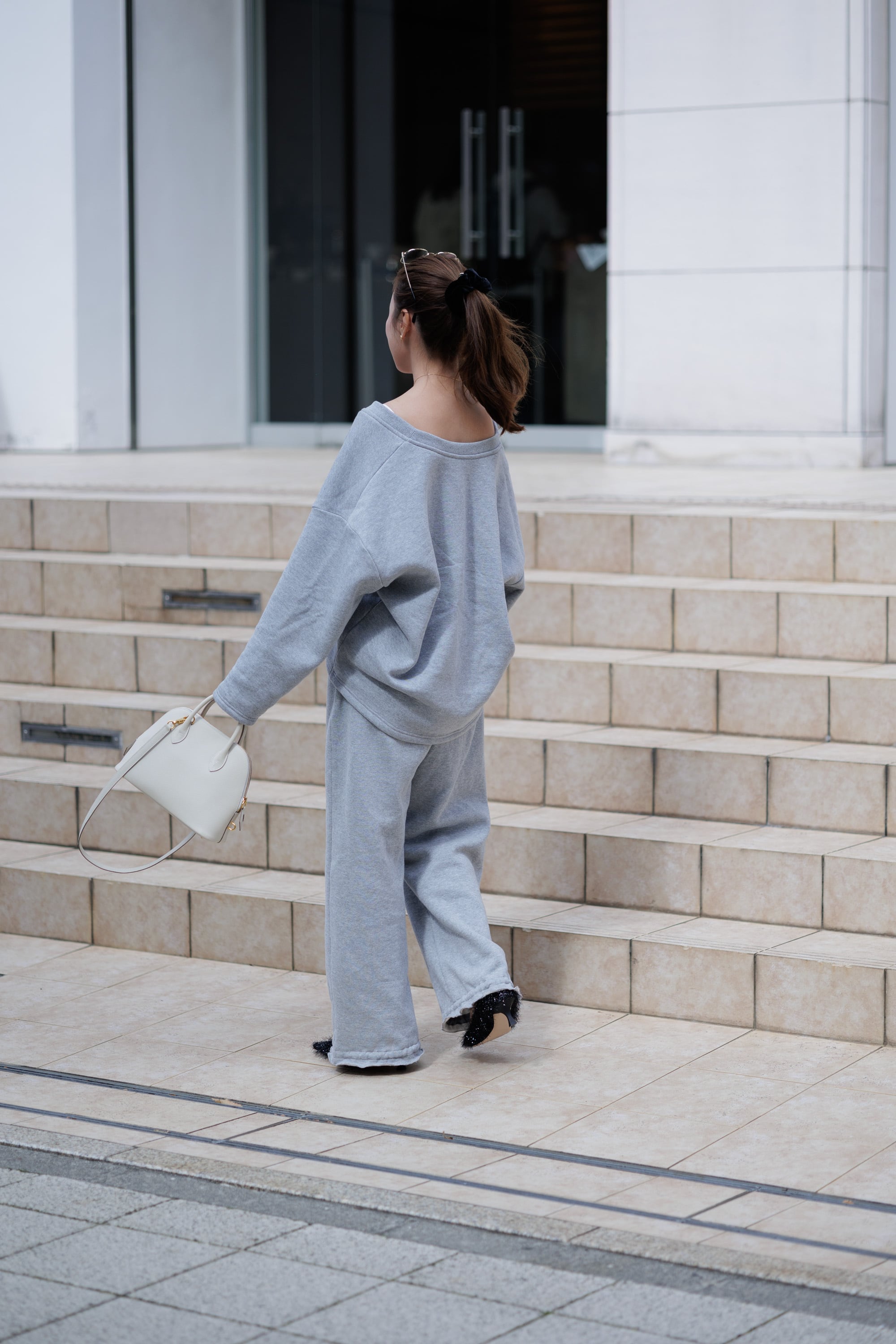 トップスは、抜け感のあるVネックラインとゆるシルエット。