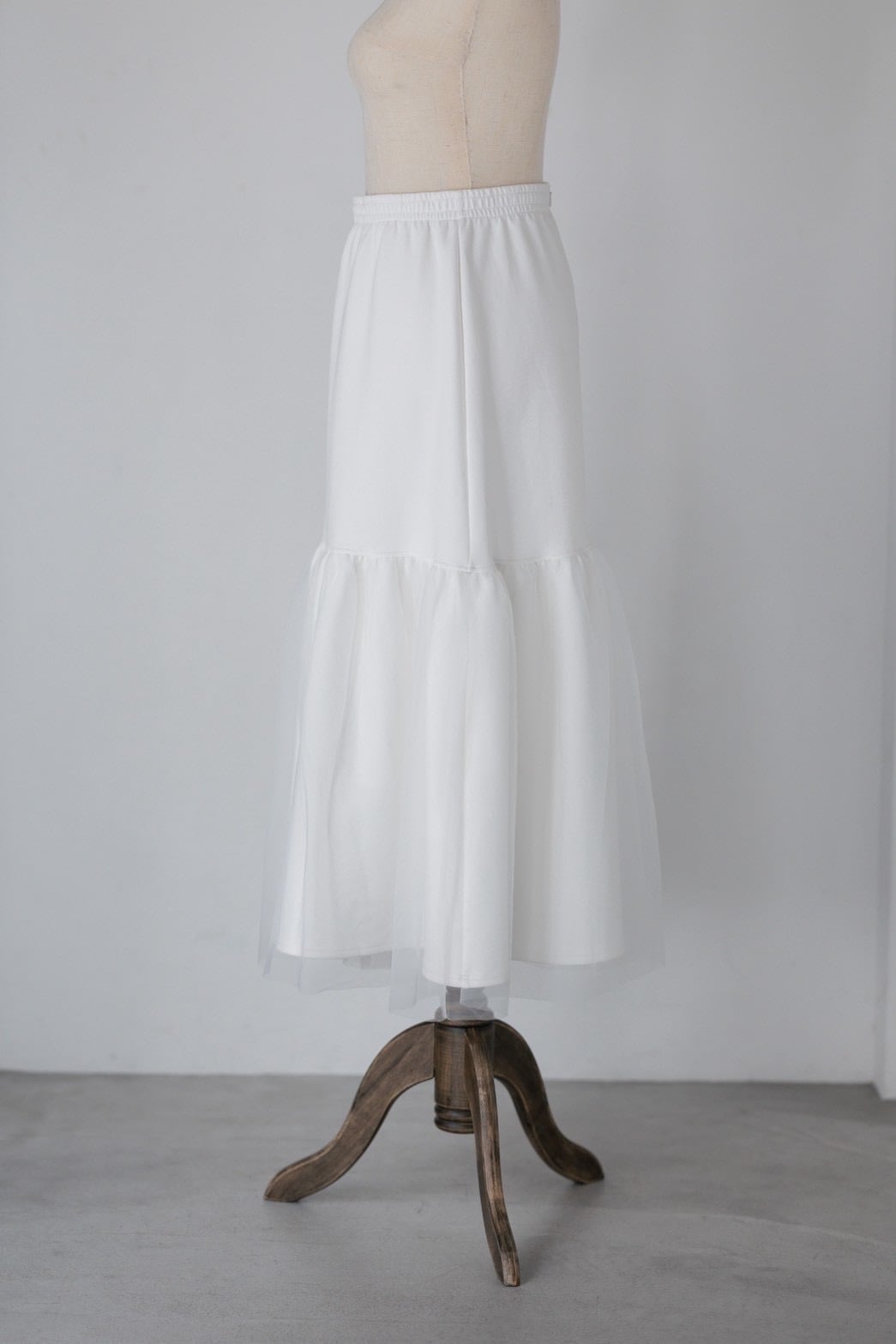 ストレッチの効いた楽な履き心地に、裾のチュールで華やかな女性らしさをプラスした1枚。